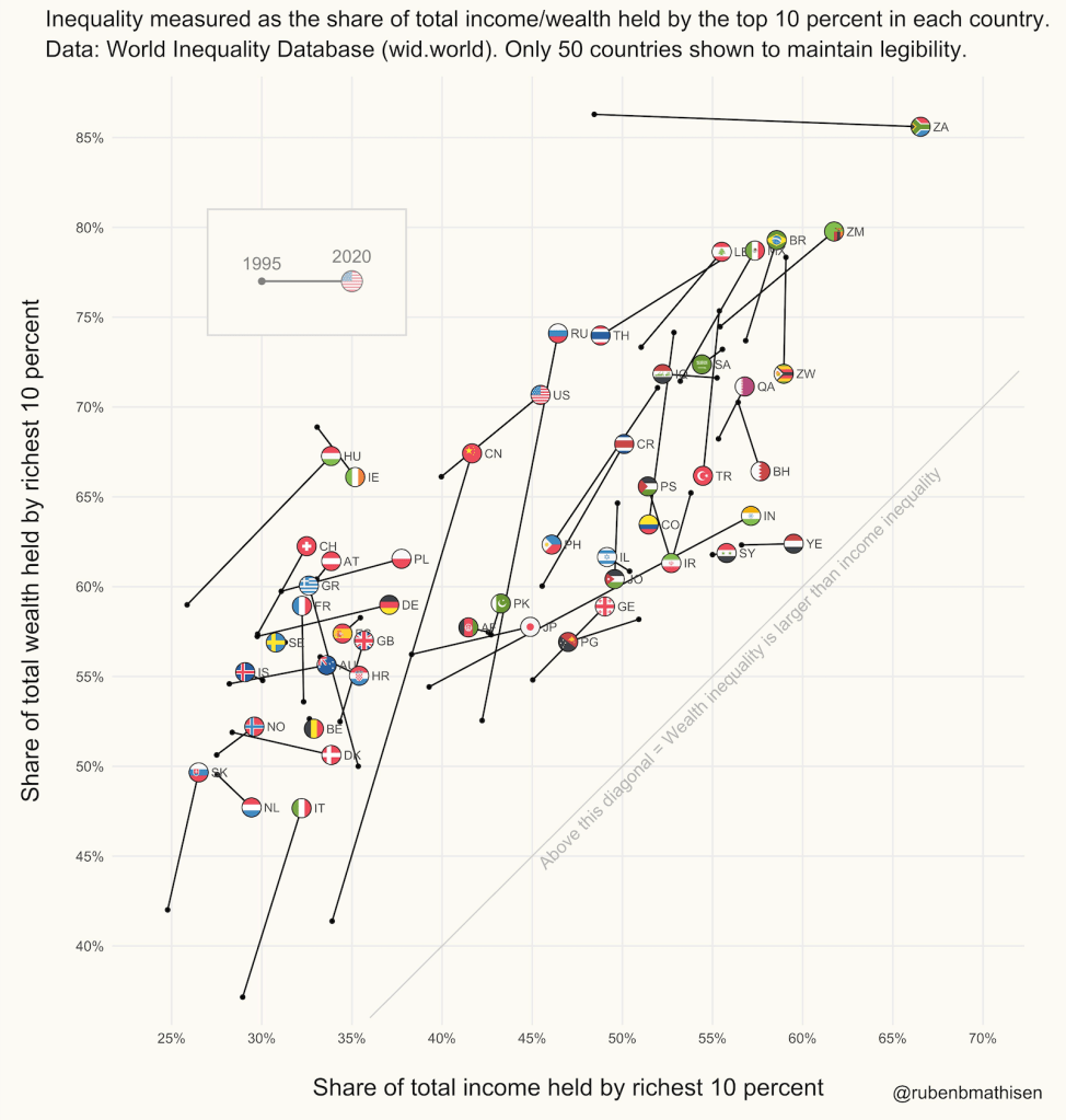 The World GDP as a pie chart. A rough and simple way to look at is: US ~1/4, China ~1/5, Europe ~1/4, Japan ~5%, India ~5%, everyone else ~20%.